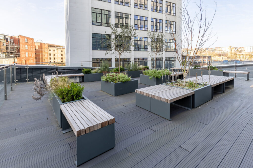 As part of the project, Langley Design collaborated with Kier Construction and AHR to design, manufacture, and install a bespoke package of street furniture – including cycle shelters and racks, amphitheatre and gabion tiered seating, picnic tables, benches, recycling units, bollards, and door barriers—crafted with biodiversity in mind and using recycled or responsibly sourced materials wherever possible.
