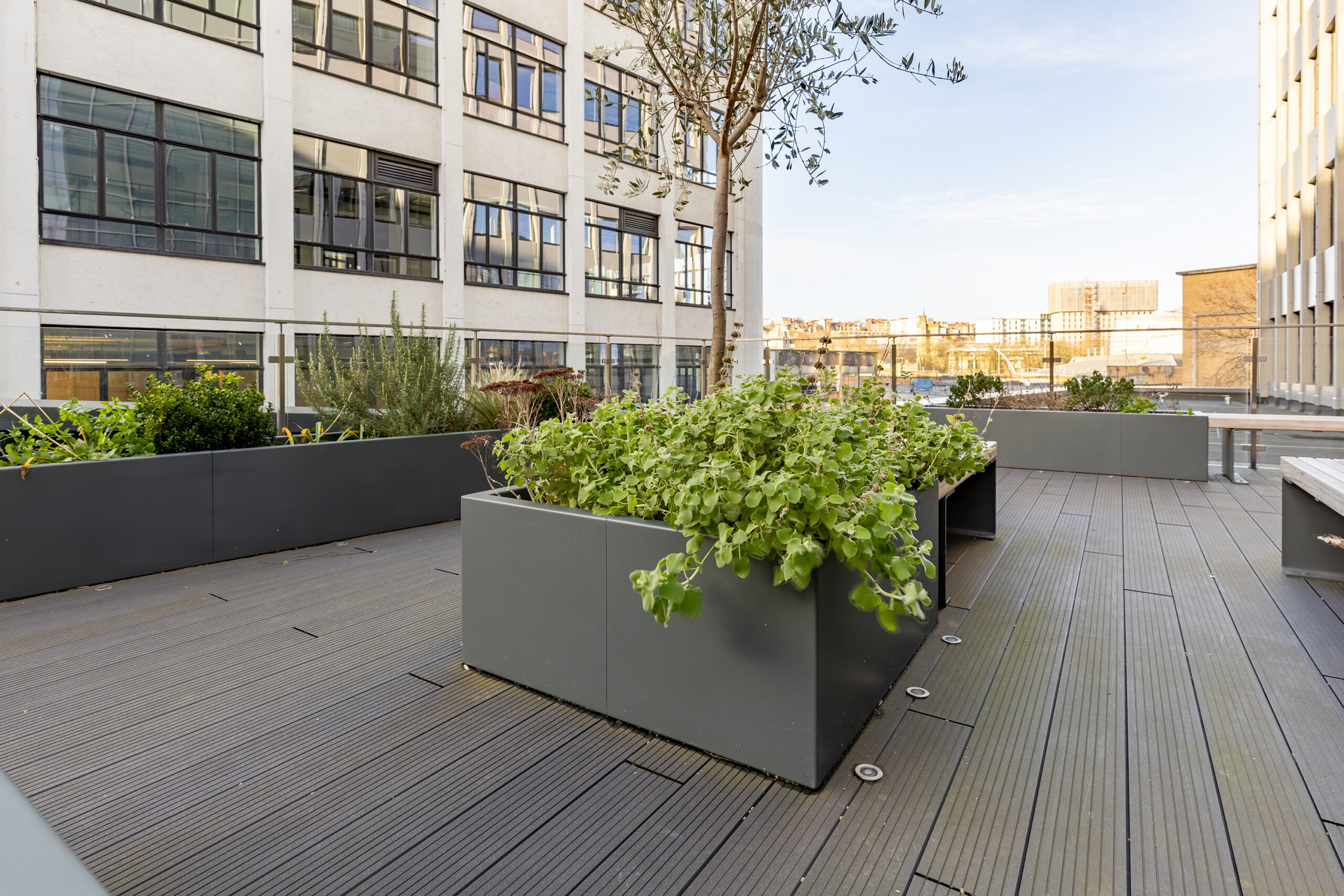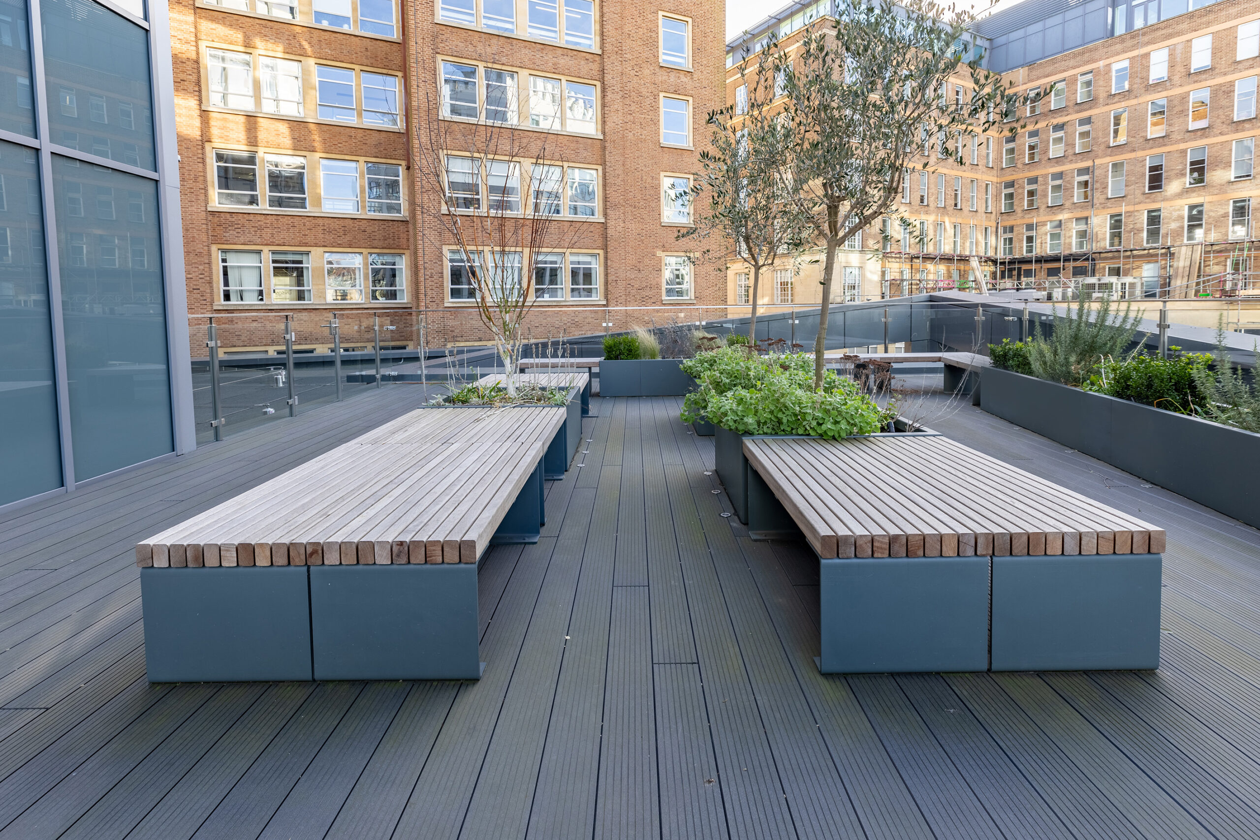 Sheldon Recycled Plastic grey bench tops (SBN308) were installed on gabion baskets to create distinctive and aesthetically pleasing three tier seating for spectators in the sports area. Using the combination of recycled plastic slats on gabion baskets makes this seating option desirable in heavy use areas due to its durability and stability, while offering design continuity with the academy’s sustainable aesthetic and functional landscape features.
