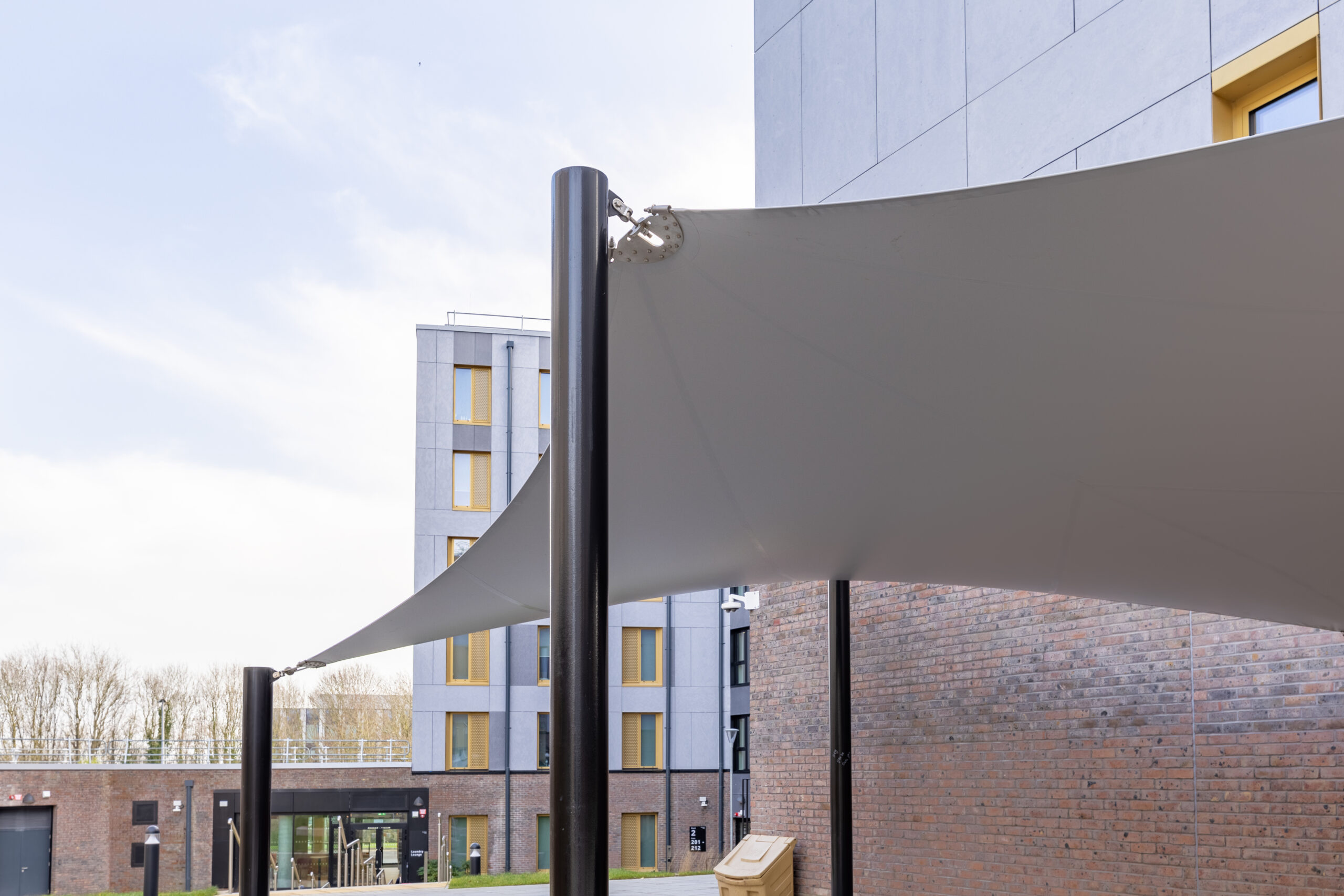 A Pewsham Tensile Fabric Hypar Canopy (PTC401) was installed to create a versatile outdoor space for students to eat, meet, and relax. Measuring 10m x 5m, the canopy is supported by galvanised steel posts powder-coated in RAL9005 Jet Black, while the Boulder-coloured fabric complements the campus environment. The structure provides shelter from the elements while enhancing the visual and functional quality of the outdoor space.