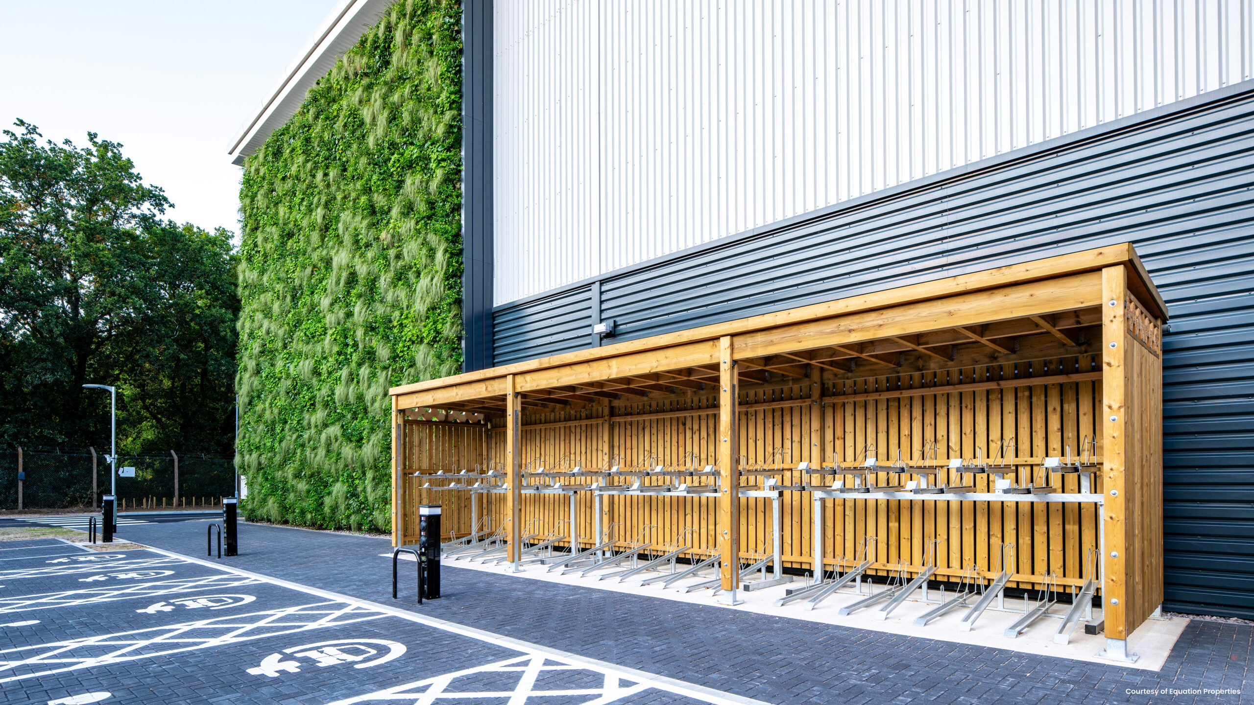 The sedum roof cycle shelter supports sustainable travel and provides secure parking for up to 50 bicycles, while the integrated bin stores offer discreet, secure waste management. Carefully positioned seating areas encourage wellbeing and social interaction, and the timber pergola introduces shade, structure and planting opportunities to soften the parking environment.